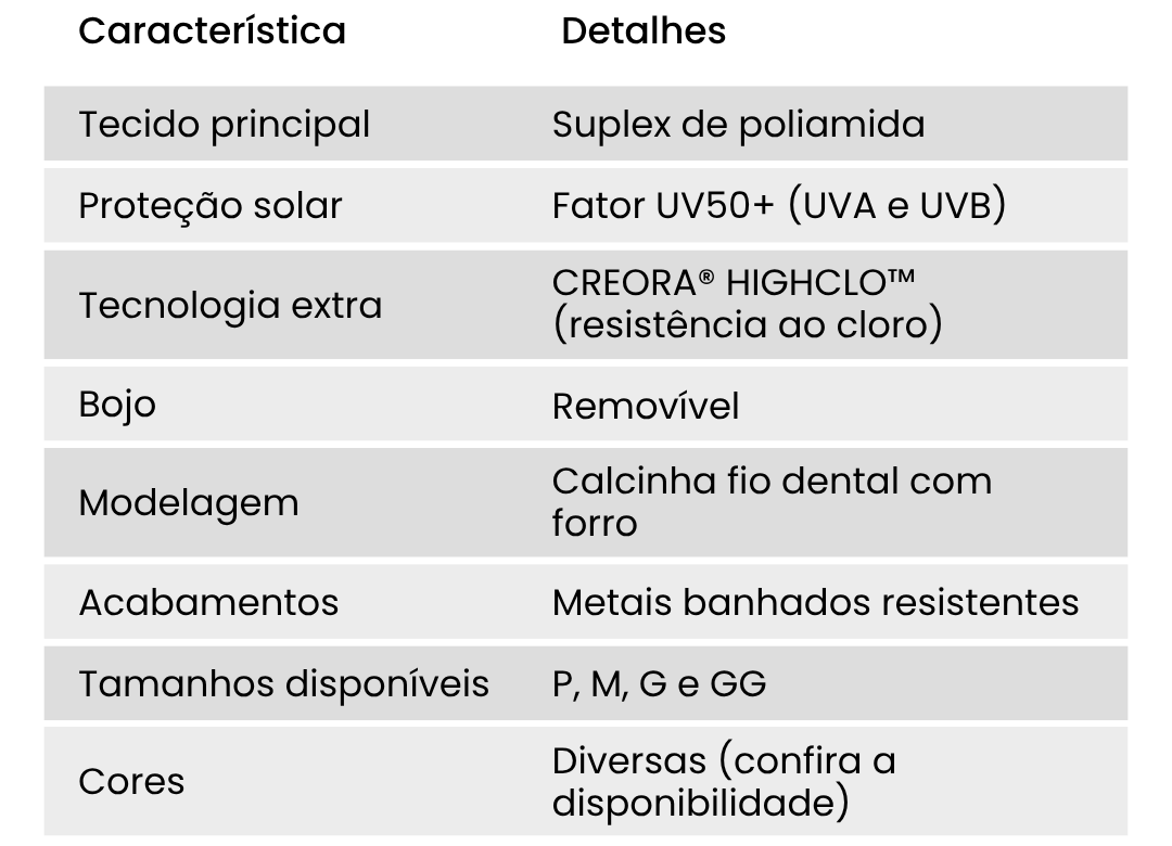 O Biquíni Bronze é confeccionado com suplex premium e a inovadora tecnologia CREORA® HIGHCLO™, que proporciona até 3x mais resistência ao cloro, suor e lavagens, mantendo a elasticidade e a cor por muito mais tempo.